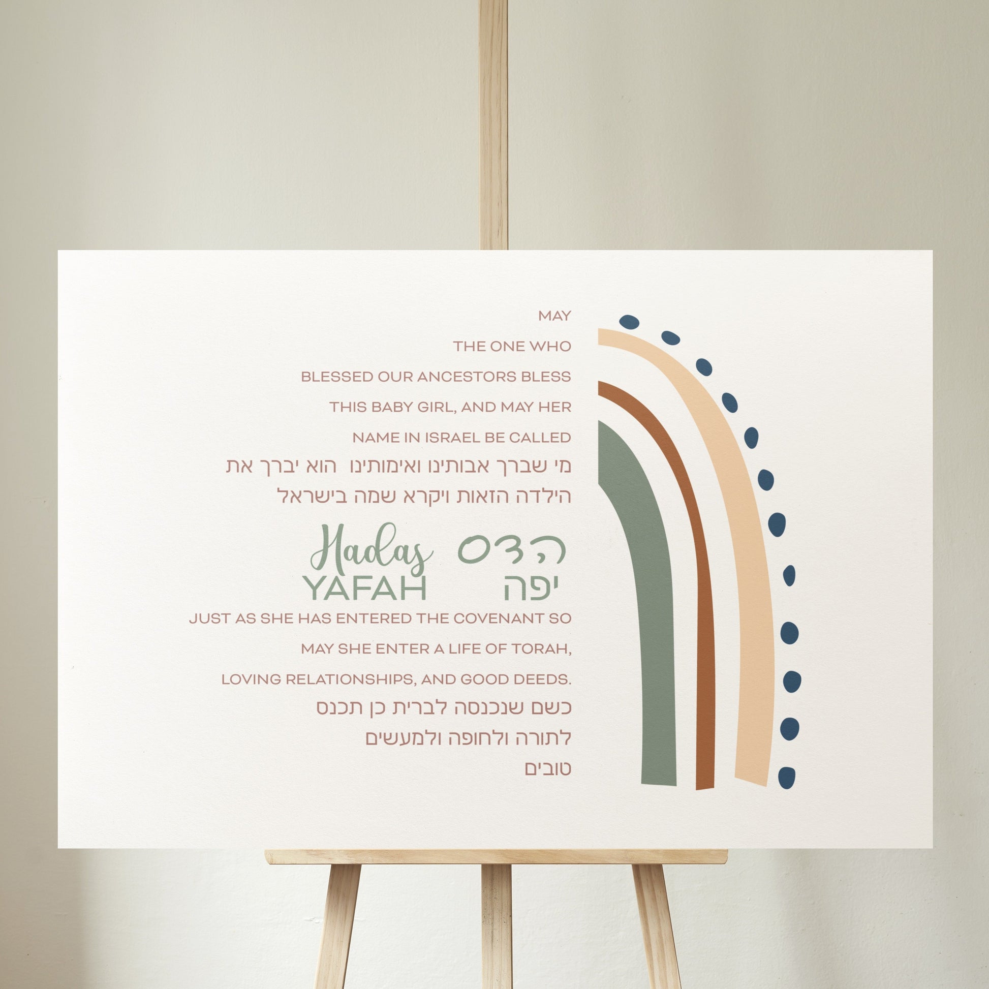 Honor the arrival of a beloved baby with the Boho Rainbow Baby Hebrew Name Art — a tender and meaningful keepsake that celebrates their name, blessing, and place in the Jewish community. This elegant design features a modern boho rainbow in soft blush, cream, and sage tones, with whimsical dotted accents and a gentle arc that frames the English and Hebrew names with beauty and intention.