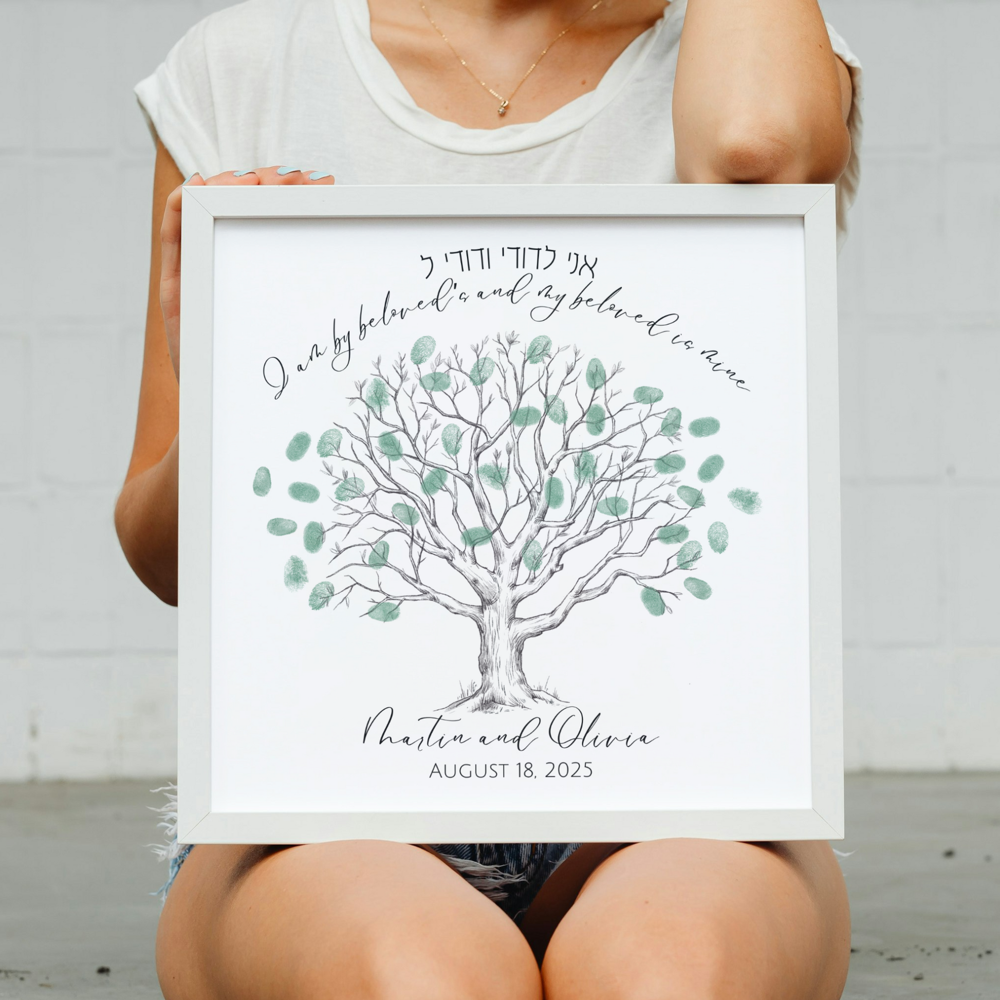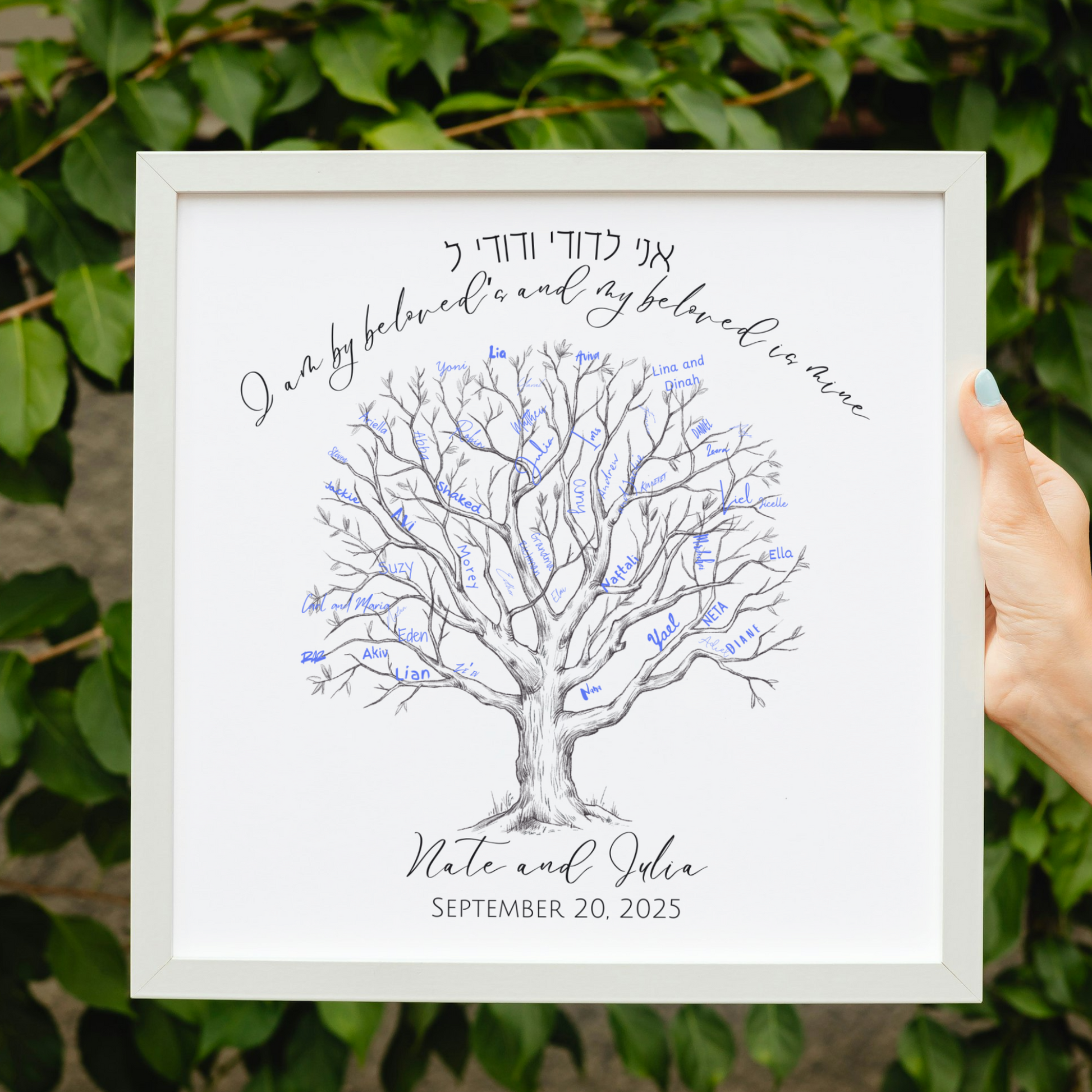 Capture the heartfelt love of every guest with a truly unique and interactive keepsake. This Jewish Alternative Guest Book with the adored quote "I am my beloved's and my beloved is mine" in Hebrew and English transforms the tradition of signing into a beautiful work of art. It features a hand-drawn tree symbolizing the strong, growing foundation of your relationship. Personalized with your names and wedding date, this piece becomes a collaborative creation, a physical testament to your community of loved ones.