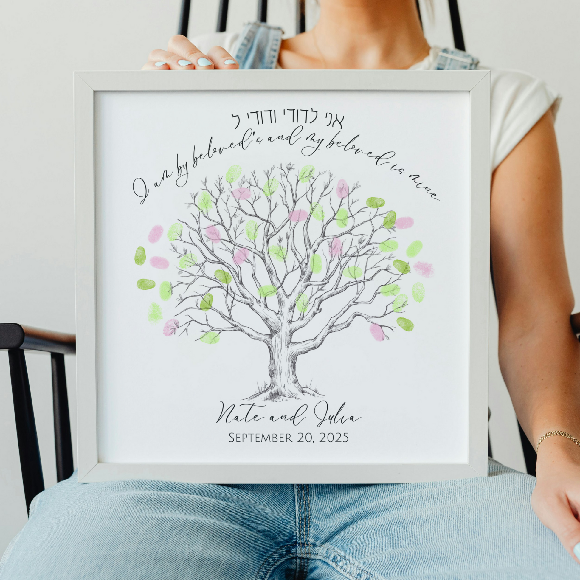 The thoughtful design offers a pragmatic and charming choice for you: guest may either leave a colorful fingerprint to form the leaves or sign their name on the branches with a pen. This is the perfect option for couples who seek a sentimental, elegant, and modern way to commemorate their special day. After your wedding, this cherished print can be proudly displayed in your home, serving as a constant, beautiful reminder of the love that surrounded you.