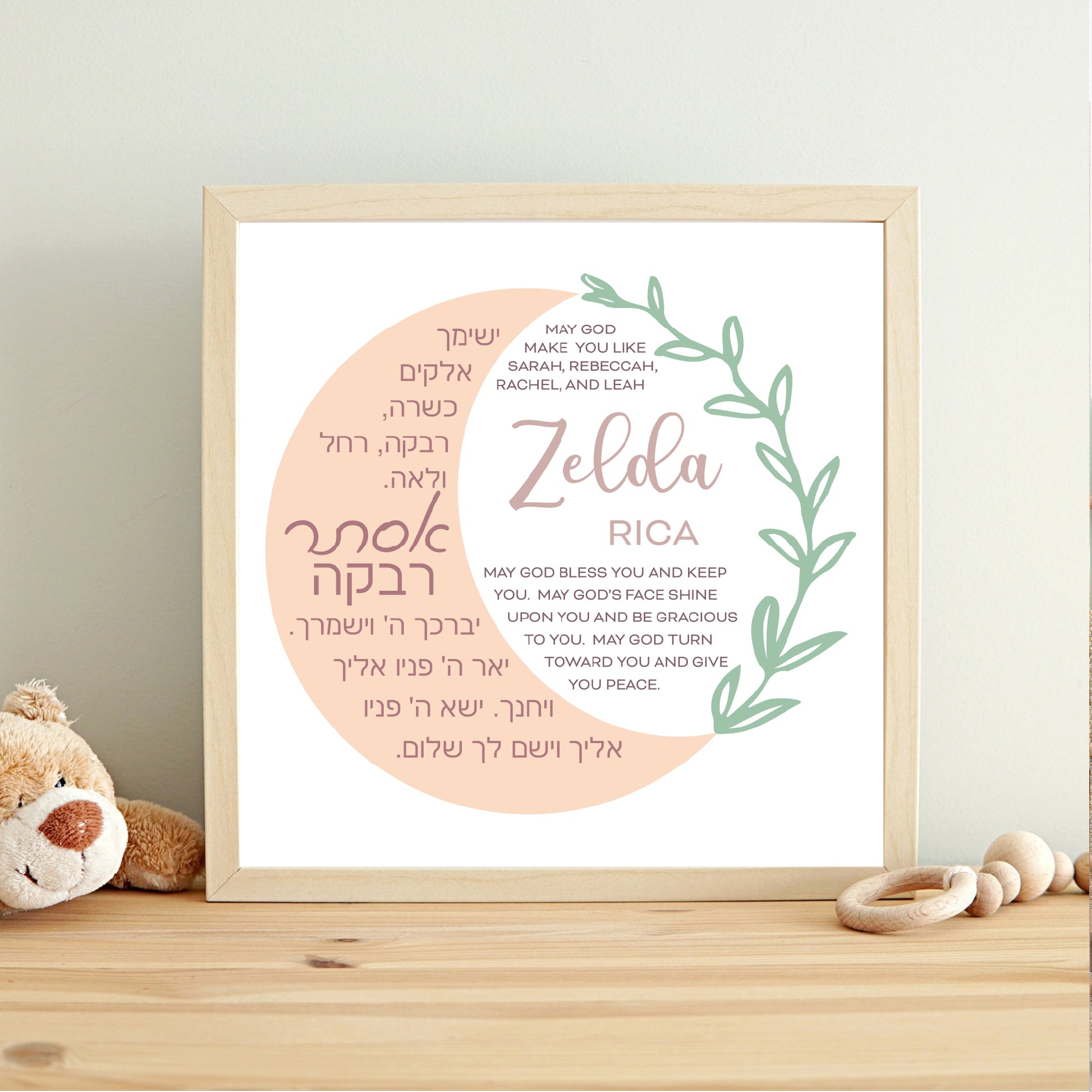 Embrace tradition and celebrate your new baby with our Boho Moon Birkat HaYeladim Decor, a truly exquisite piece designed to bring blessings into their life and home. This charming artwork features a lunimous moon and botanical elements, creating a serene frame. Within this beautiful design, the profound Birkat HaYeladim (Parental Blessing for Children is elegantly presented in both Hebrew and English, personalized with their unique name. This cherished blessing invokes the matriarchs or patriarchs, offering wishes for her to be like Sarah, Rebekah, Rachel, and Leah, or like Ephraim and Menashe, and to be blessed with a life of goodness and grace.