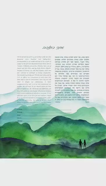 ✔The watercolor mountain landscape ketubah has shades of blue and green in gorgeous mountains, and features a tiny couple looking out over the beautiful landscape together. There are also same sex options for the couple icon that I have prepared but if none of these fit for you contact me about finding a custom option. It is elegant, peaceful, symbolizes the great adventure you have awaiting you in your life together. It is a high quality art print on Archival Matte paper -300 gsm, 9.5 mil: Smooth, neutral-white, matte paper for high-quality fine art.