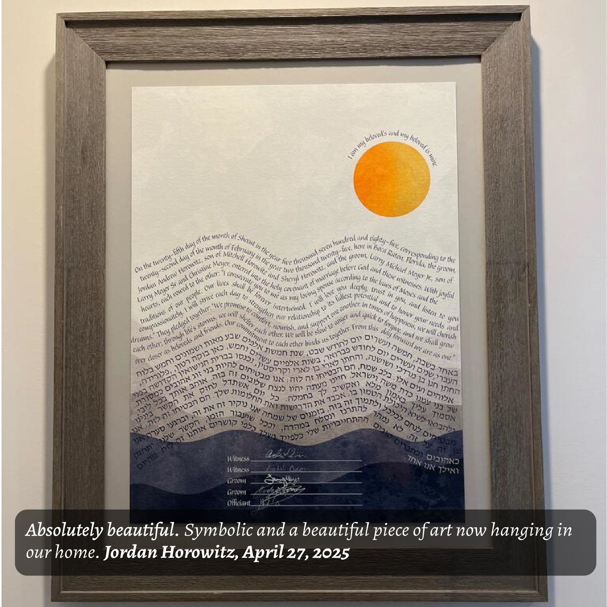 Capture the radiant warmth of your love with this sun-kissed word art Ketubah, featuring a golden orb and softly curved text that evokes a sense of joyful movement.